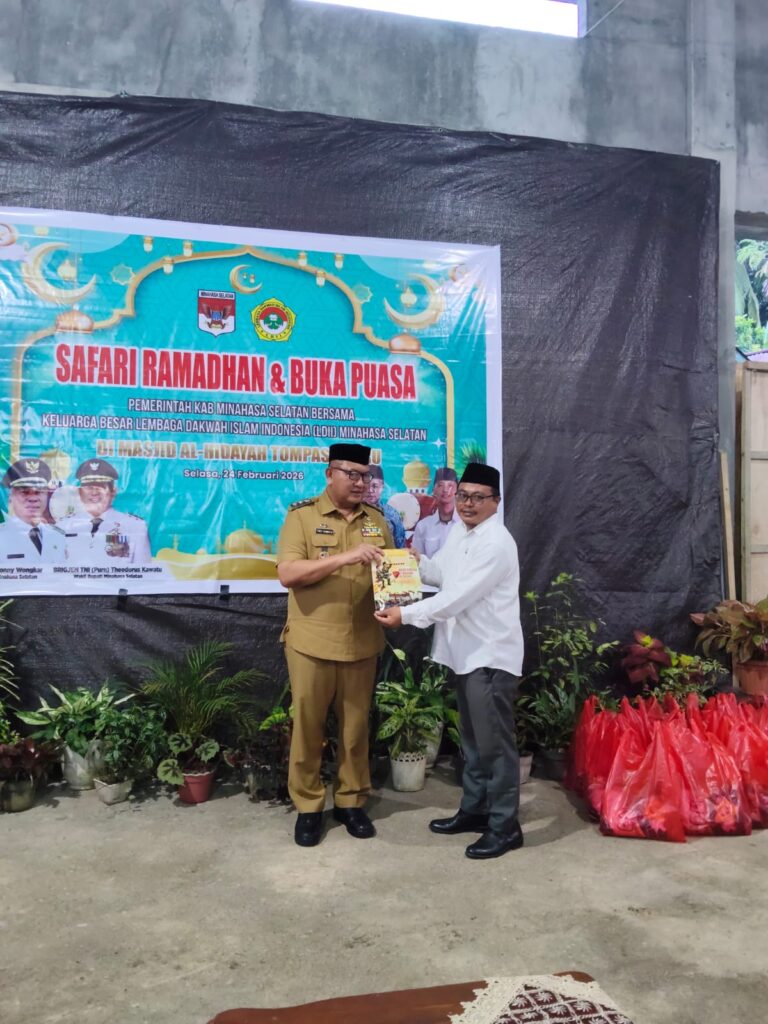 Wakil Bupati Minahasa Selatan, Brigjen TNI (Purn.) Theodorus Kawatu, S.I.P., menghadiri Safari Ramadan Pemerintah Kabupaten Minahasa Selatan Tahun 2026 di Masjid Al Hidayah Tompaso Baru Satu, Kecamatan Tompaso Baru. Kegiatan ini diawali dengan tausiyah yang mengajak jamaah meningkatkan keimanan dan ketakwaan serta menjaga kerukunan antarumat beragama, dilanjutkan dengan buka puasa bersama dalam suasana hangat dan penuh kebersamaan.