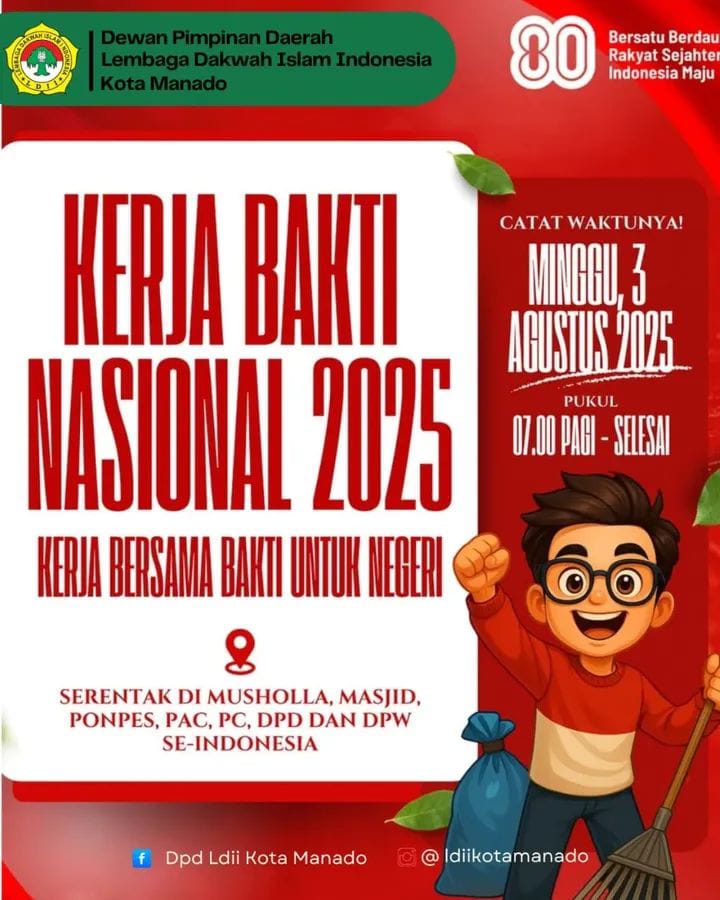 Manado, 3 Agustus 2025 — Dalam rangka mensukseskan Kerja Bakti Nasional 2025 yang dicanangkan oleh Dewan Pimpinan Pusat (DPP) Lembaga Dakwah Islam Indonesia (LDII), serta menyambut Hari Ulang Tahun ke-80 Republik Indonesia, warga LDII se-Sulawesi Utara bersama masyarakat sekitar menggelar aksi bersih-bersih serentak di halaman, fasilitas masjid, dan lingkungan sekitar.